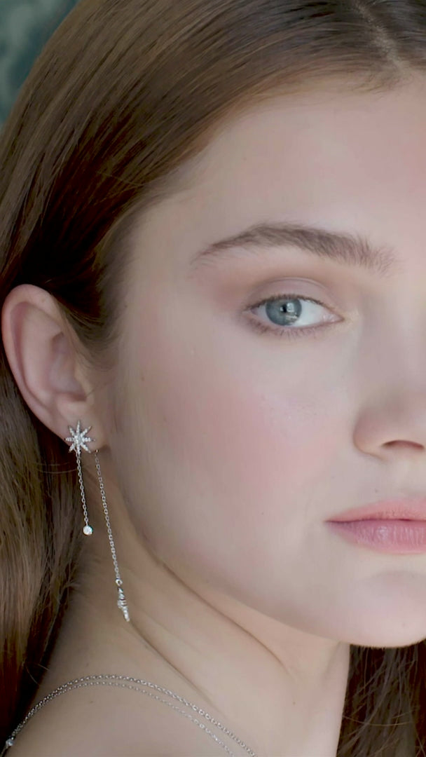 The North Star Palazzo Earrings are Crafted from sterling silver, they feature a stunning white zircon North Star at the center, a mix of marquise and round zircon cuts are dangling by a fine silver chain. These earrings capture the sparkle of the night sky.