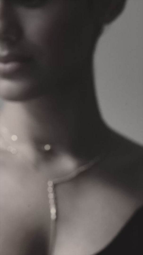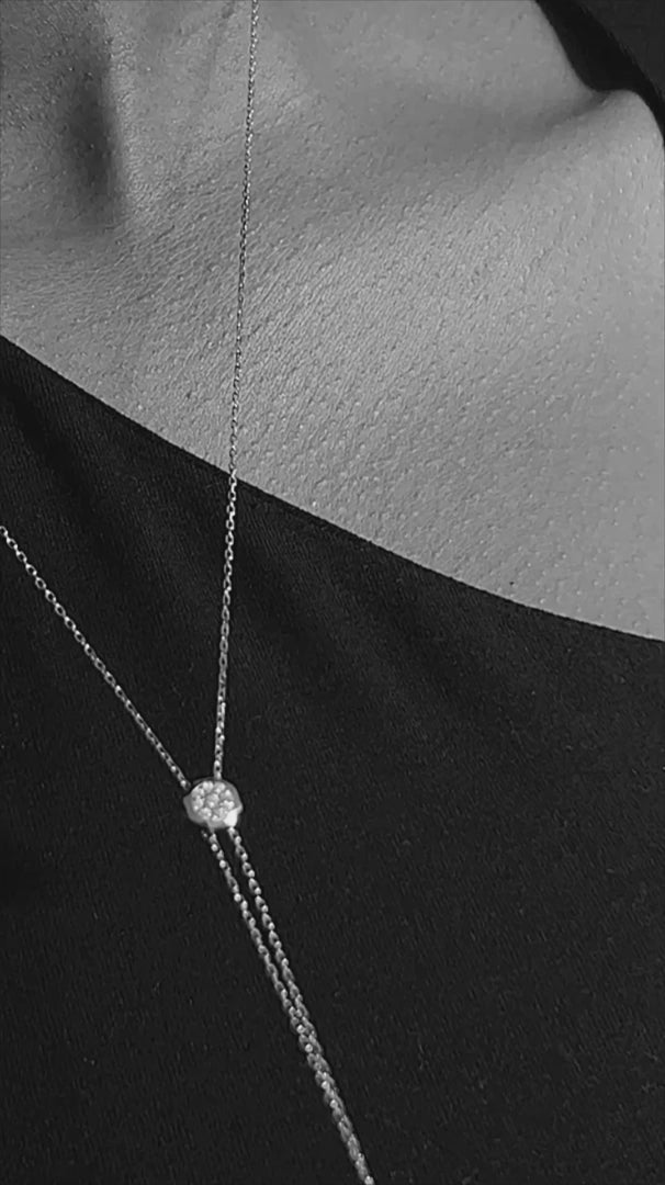 A sleek silver lariat that falls effortlessly along the neckline. White rounded zircon stones catch the light , adding just the right amount of sparkle. Perfect for layering or wearing solo.